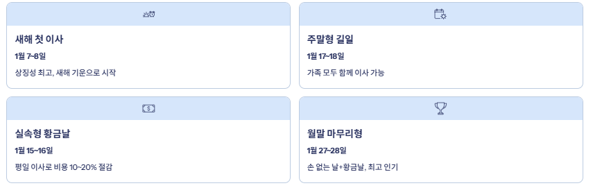 | 실속형 황금날 | 1월 15~16일 (목·금) | 평일 일정으로 이사비 절감 가능 |