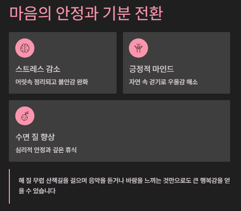 특히 자연이 있는 곳을 걸으면 우울감이나 불안감이 완화되고, 긍정적인 생각이 늘어납니다.