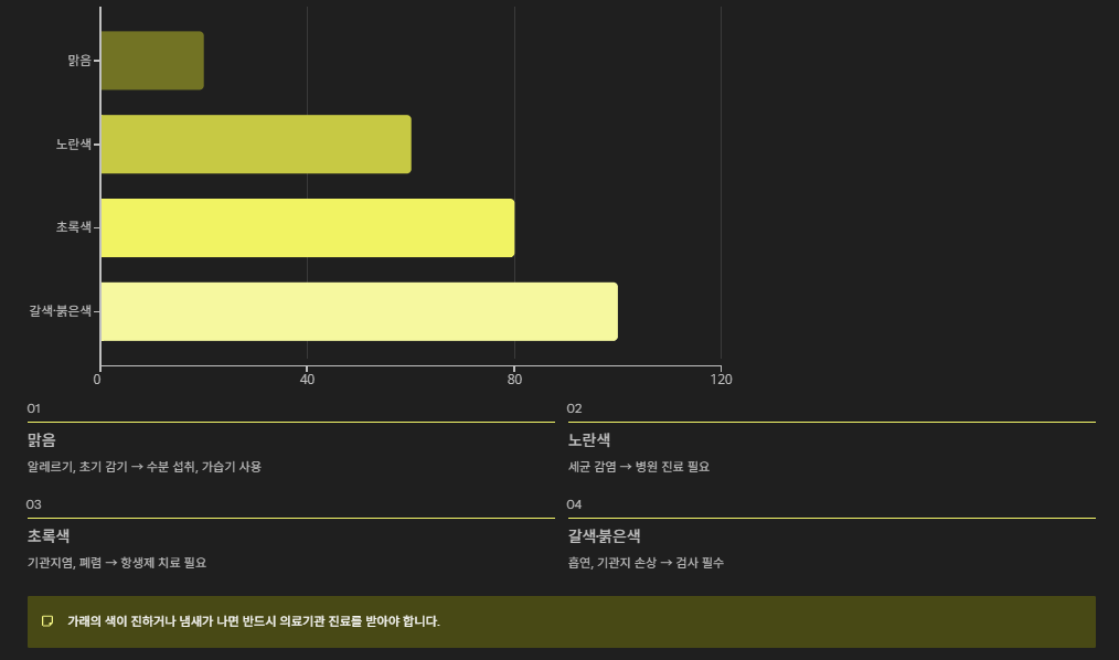 | 갈색·붉은색 | 흡연, 기관지 손상 | 검사 필수 |
