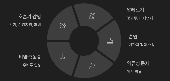 봄철 꽃가루, 겨울철 미세먼지, 담배 연기 등도 기관지 자극의 원인이 됩니다.
