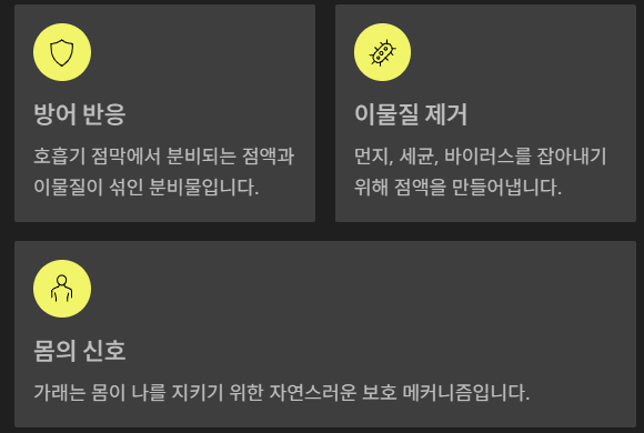 우리 몸은 먼지, 세균, 바이러스 등이 들어오면 이를 잡아내기 위해 점액을 만들어내는데, 이게 바로 가래입니다.