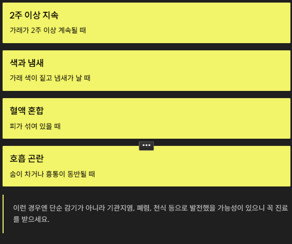 이런 경우엔 단순 감기가 아니라 기관지염, 폐렴, 천식 등으로 발전했을 가능성이 있으니 꼭 진료를 받으세요.