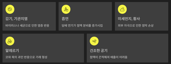 | 건조한 공기 | 점액이 끈적해져 배출이 어려움 |