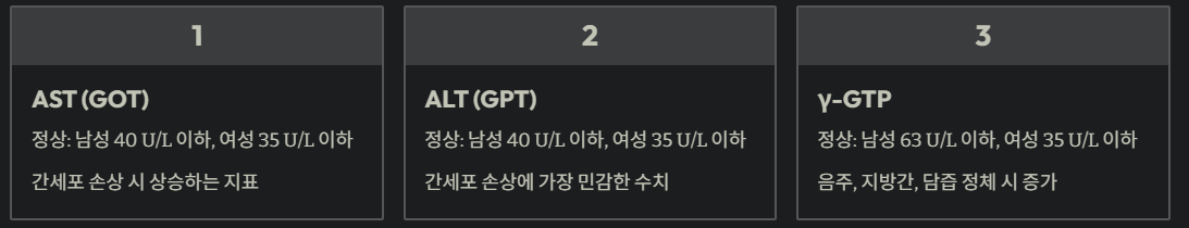 | ALT(GPT) | 남성: 40 U/L 이하 / 여성: 35 U/L 이하 | 간세포 손상에 가장 민감 |