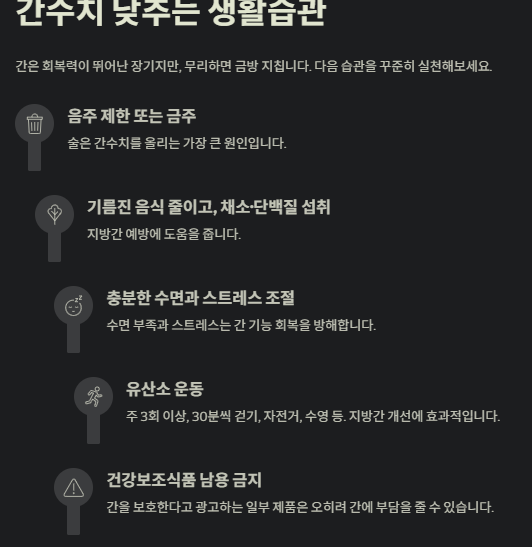 | 과음 | 알코올이 간세포를 손상시켜 염증 유발 | γ-GTP 수치 급상승, 숙취 시 악화 |