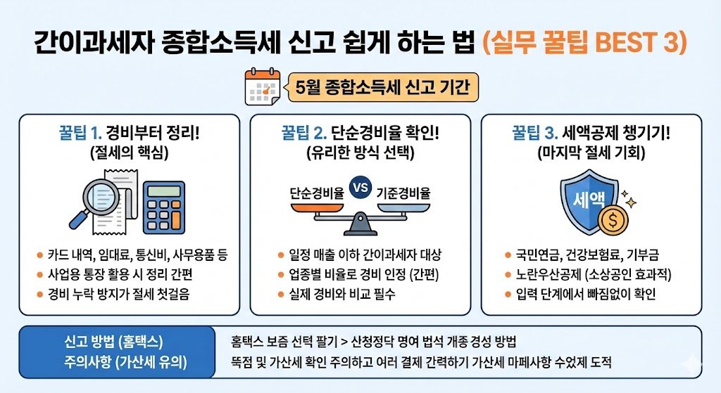 5월이 되면 사업자분들 머릿속이 복잡해집니다. 특히 처음 신고하는 분들은 간이과세자 종합소득세 신고가 어렵게 느껴질 수 있습니다. 간이과세자라고 해서 세금이 간단한 것은 아니기 때문입니다. 하지만 핵심만 알면 생각보다 수월하게 끝낼 수 있습니다. 오늘은 실무에서 바로 써먹을 수 있는 꿀팁 3가지를 중심으로 정리해드리겠습니다.