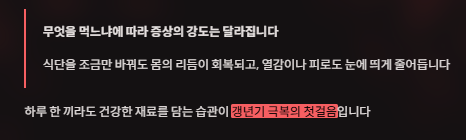 A. 카페인, 매운 음식, 인스턴트, 술 등은 체온을 높이고 증상을 악화시킬 수 있습니다. 가능한 한 줄이는 것이 좋습니다.