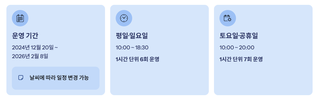 - 평일 및 일요일: 10:00 ~ 18:30 (1시간 단위 6회 운영)