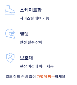스케이트를 처음 타는 분들도 걱정하지 않아도 됩니다. 현장에 안전요원이 상주하며, 초보자용 구역도 따로 마련되어 있습니다.