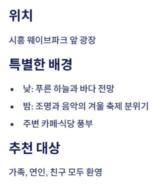 넓은 바다를 배경으로 설치되어 있어, 낮에는 푸른 하늘과 바다를 보며 즐길 수 있고, 밤에는 조명과 음악이 어우러져 겨울 축제 분위기를 물씬 느낄 수 있습니다.