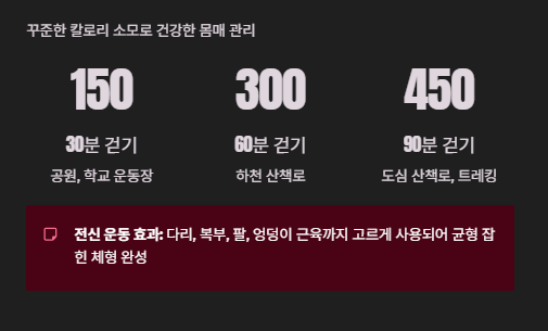 | 90분 | 약 450kcal | 도심 산책로, 트레킹 코스 |