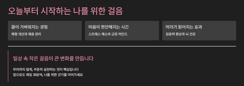 걷기운동은 단순히 몸을 움직이는 행위가 아니라 삶의 질을 높여주는 실천입니다.