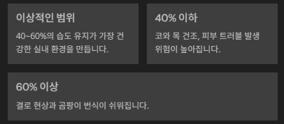 40% 이하로 떨어지면 코와 목이 건조해지고, 피부 트러블이 생길 수 있습니다.