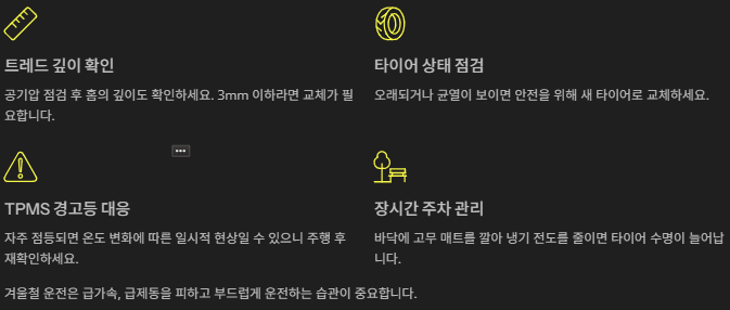 관리와 함께 휠 밸런스, 얼라인먼트, 브레이크 상태도 함께 점검하세요. 특히 빙판길이 많은 지역에서는 감속 운전을 습관화하고, 스노우체인을 사용할 때는 공기압을 다시 조정해 균형을 맞추는 것이 좋습니다. 타이어가 균등하게 지면에 닿도록 조정하면 마찰력도 향상됩니다.