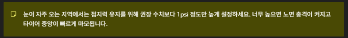 단, 눈이 자주 오는 지역이라면 접지력을 유지하기 위해 권장 수치보다 1psi 정도만 높게 설정하는 것이 좋습니다.