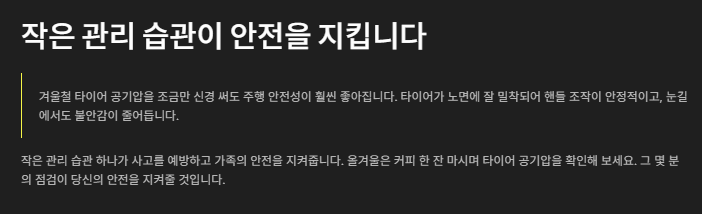 작은 관리 습관 하나가 사고를 예방하고, 가족의 안전을 지켜주는 큰 역할을 한다는 걸 매번 느낍니다. 올겨울은 커피 한 잔 마시며 타이어 공기압을 확인해 보세요. 그 몇 분의 점검이 당신의 안전을 지켜줄 것입니다.
