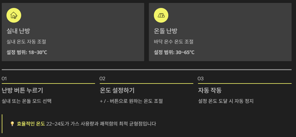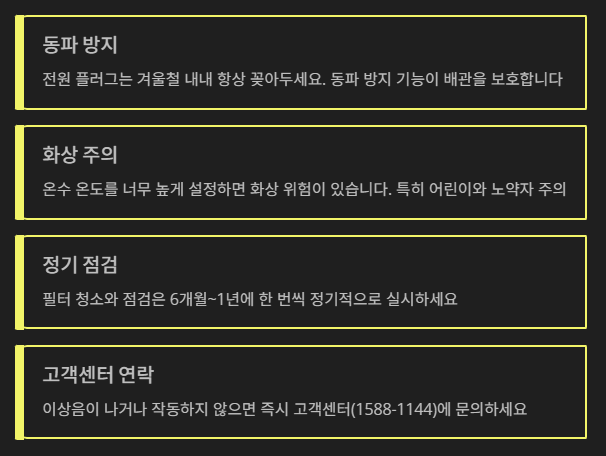 특히 예약 난방과 빠른 온수 기능은 실제로 써보면 생활이 훨씬 편리해져요.