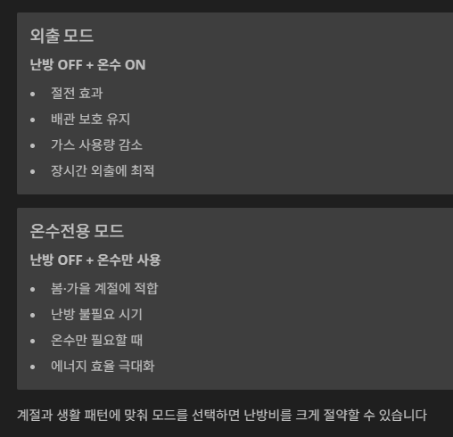 기본적인 배관 보호는 그대로 유지되면서 가스 사용량은 줄어들기 때문에, 장시간 외출할 때 유용합니다.