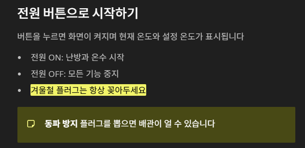 단, 겨울철에는 플러그를 뽑지 않는 것이 중요합니다. 플러그를 제거하면 동파 방지 기능이 작동하지 않아 배관이 얼 수 있기 때문이죠.