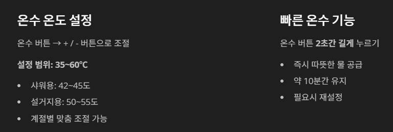 일부 모델에는 **‘빠른 온수 기능’**이 있어 온수 버튼을 2초간 누르면 즉시 따뜻한 물이 나옵니다. 이 기능은 약 10분간 유지된 뒤 자동으로 꺼지며, 필요할 때마다 다시 설정하면 됩니다.