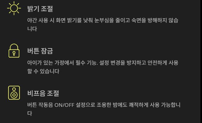 일부 모델에는 비프음(삐 소리) ON/OFF 설정도 가능합니다. 조용한 밤에 소리를 끄면 훨씬 쾌적합니다.