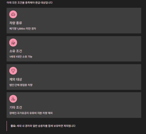 예를 들어, 세대 내에 경차와 일반 승용차를 함께 보유 중이라면 환급 대상에서 제외됩니다.