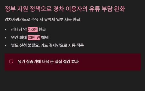 간단히 말해, 경차사랑으로 결제만 해도 자동으로 유류세가 환급되는 구조입니다.