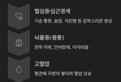 - 협심증·심근경색: 가슴 통증, 숨참, 식은땀 등 갑작스러운 증상