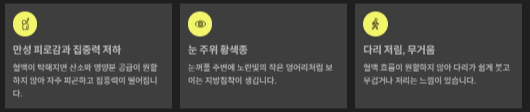 - 혈액 흐름이 원활하지 않아 다리가 쉽게 붓고 무겁거나 저리는 느낌이 있을 수 있습니다.