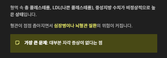 A. 혈관 내에 지방이 쌓여 심혈관계 질환(심근경색, 뇌졸중 등)으로 이어질 수 있기 때문입니다.