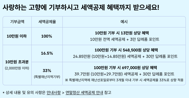 단순히 좋은 일을 하는 것을 넘어 연말정산에서도 실속 있는 혜택을 제공합니다. 연말정산에서의 공제는 아래와 같이 적용됩니다.