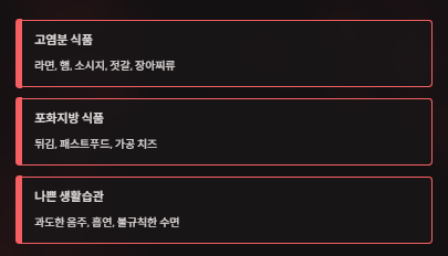 또한 튀김, 패스트푸드, 가공된 치즈 등은 포화지방과 나트륨이 동시에 많아 피해야 합니다.
