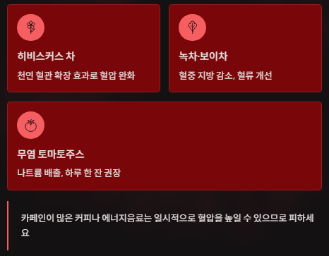 단, 카페인이 많은 커피나 에너지음료는 일시적으로 혈압을 높일 수 있으므로 피하는 것이 좋습니다.