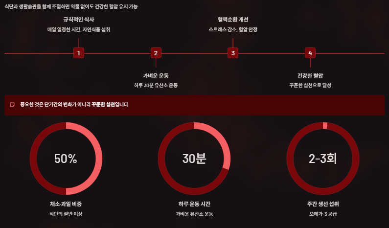 또한 음주와 흡연은 혈관 수축을 유발하므로 제한해야 하며, 규칙적인 수면과 스트레스 관리도 혈압 조절에 큰 도움이 됩니다.