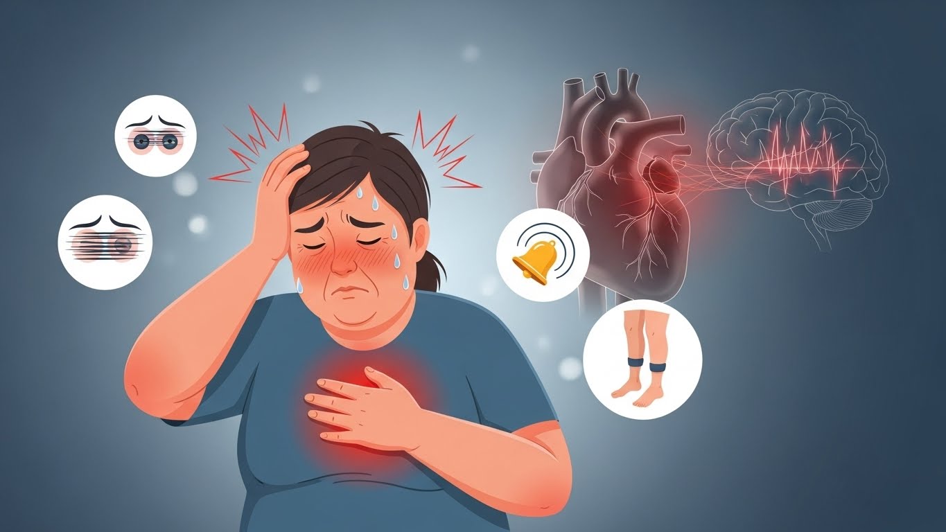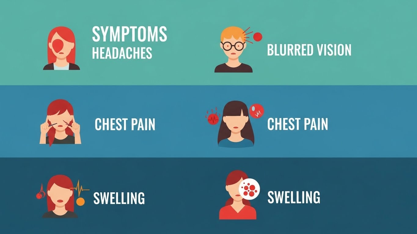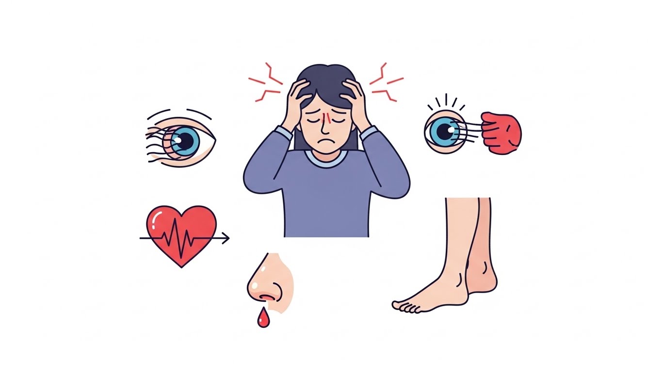A. 두통, 어지러움, 시야 흐림, 가슴 두근거림, 손발 저림 등이 대표적인 증상입니다.