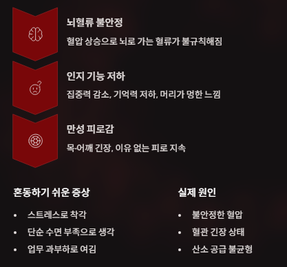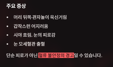 | 시야 흐림 | 눈의 혈관 긴장 | 안과 검사 병행 권장 |