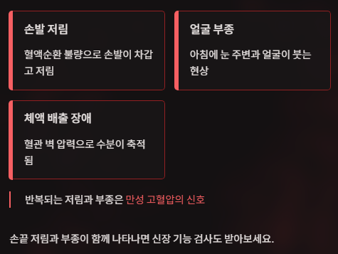 특히 손끝 저림과 부종이 함께 나타날 경우에는 혈압뿐 아니라 신장 기능 검사도 함께 받아보는 것이 좋습니다.