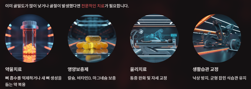이미 골밀도가 많이 낮거나 골절이 발생했다면 전문적인 치료가 필요합니다.