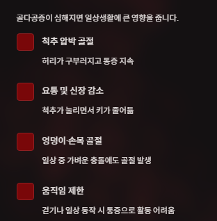 | 허리 통증 | 이유 없이 허리가 자주 아픔 | 척추가 약해져 압박이 가해지는 경우 |