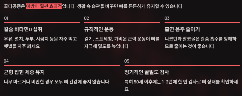 특히 50세 이후에는 1~2년에 한 번 검사로 뼈 상태를 확인하세요.