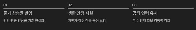 - 생활 안정 지원 – 저연차 및 하위 직급 공무원 중심의 실질 임금 보강