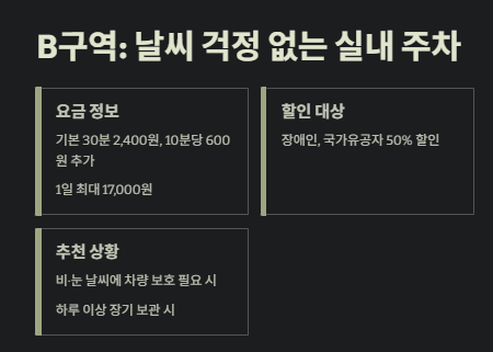 | B구역 | 민영 실내 | 30분 2,400원 | 17,000원 | 장애인·유공자 50% | 장기보관, 비·눈날씨 |