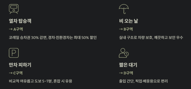 광명역 주차장은 네 구역이 모두 운영 주체와 구조가 달라, 자신의 이용 목적에 따라 선택하는 것이 중요합니다.