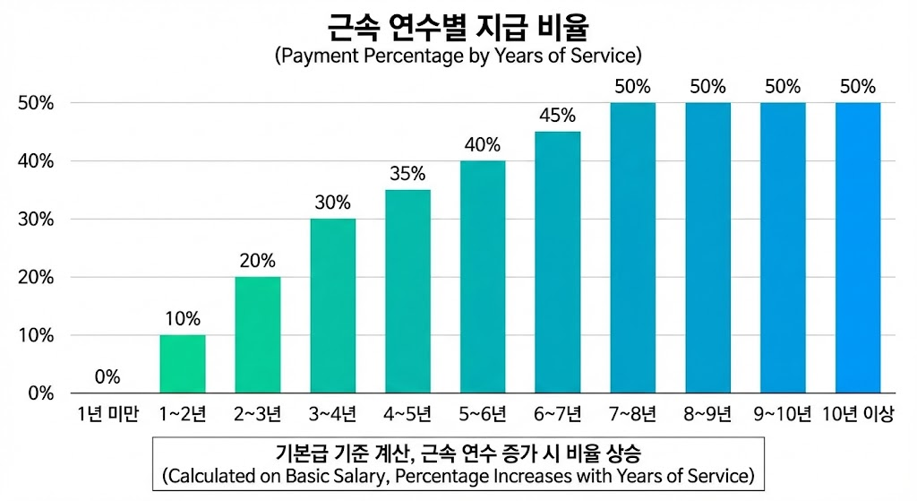 기본급의 일정 비율로 계산됩니다. 근속 연수가 늘어날수록 비율이 높아지는 구조입니다.