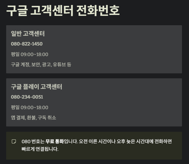 | 일반 고객센터 (광고·계정·보안 등) | 080-822-1450 | 평일 09:00~18:00 | 구글 계정, 보안, 광고, 유튜브 등 |