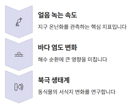 얼음이 녹아내리는 속도, 바다의 염도 변화, 북극 생태계의 이동 등이