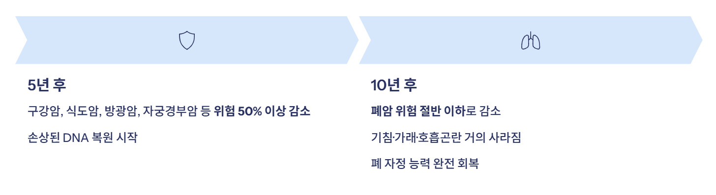 5년 이상 유지하면 구강암, 식도암, 방광암, 자궁경부암 등 흡연 관련 암의 위험이 50% 이상 감소합니다.
