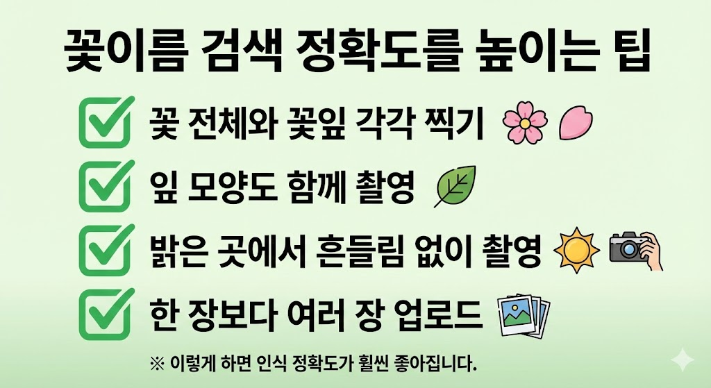꽃 전체 모습이나 꽃잎, 잎 모양이 잘 보이게 촬영하면 인식 정확도가 높아집니다.