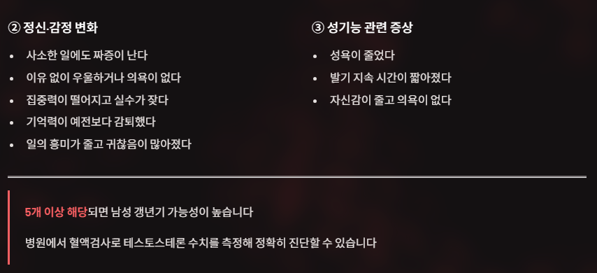 5개 이상 해당되면 남성 갱년기 가능성이 높습니다.