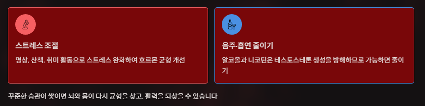 증상이 심하거나 장기간 지속될 때는 **남성호르몬 보충요법(TRT)**을 고려할 수 있습니다.